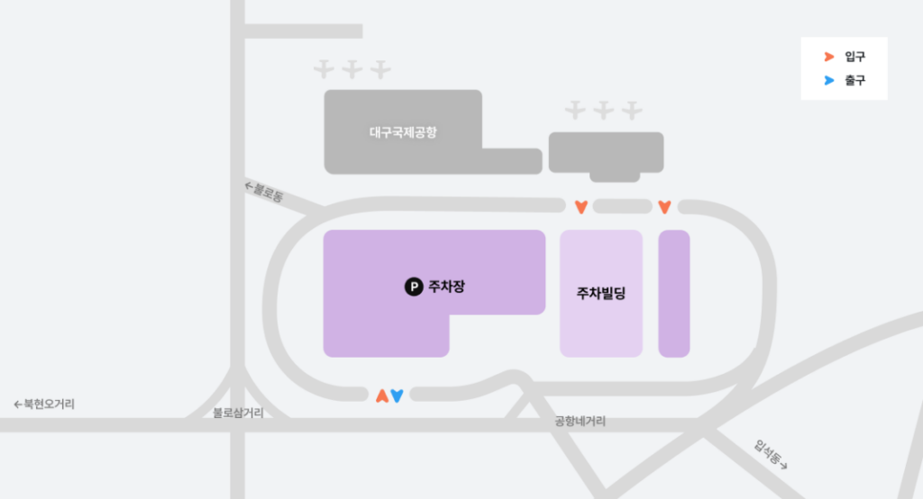현재 대구공항에는 예약 주차장 및 주차대행(발렛) 서비스가 운영되지 않습니다. 또한 별도의 장기주차 구역이 없으므로 일반 주차장을 이용하셔야 합니다.